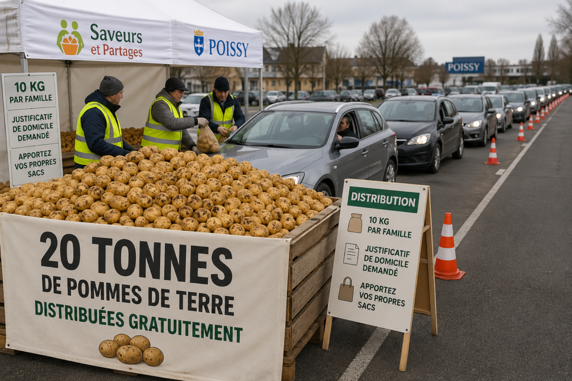 Dans un contexte où le pouvoir d’achat reste une préoccupation majeure pour de nombreux foyers, la solidarité locale s’organise. À Poissy, une initiative conjointe de la Ville et de l’association Saveurs et Partages permettra la distribution gratuite ce samedi 2 mai 2026 de 20 tonnes de pommes de terre aux habitants.