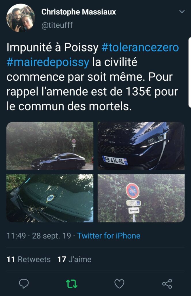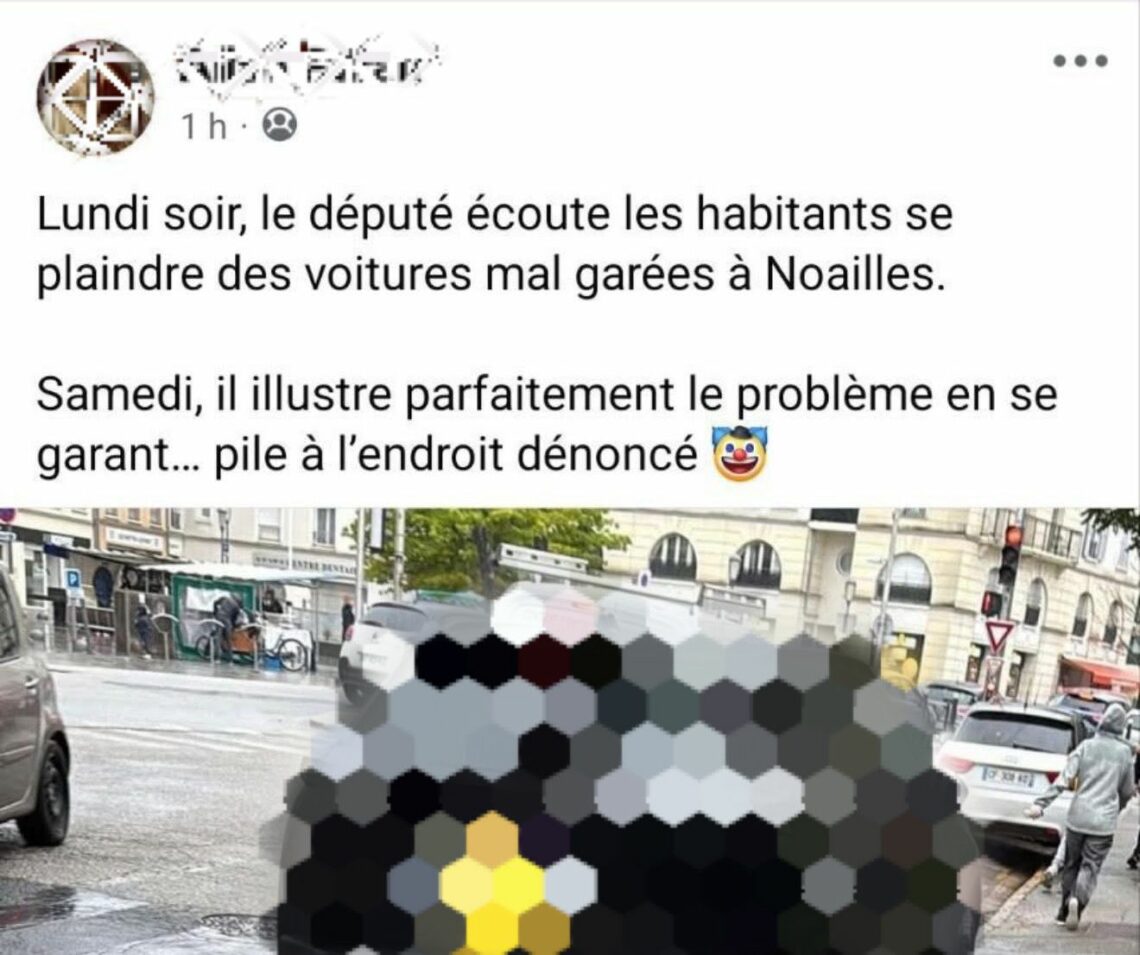 Cette réaction nous a surpris. Nous nous sommes donc rendus sur le forum où avait été posté la photo d’origine, et grâce à quelques mots clés, nous avons découvert des images datant de son mandat de maire où sa voiture serait apparu mal stationnée sur une place réservée aux personnes en situation de handicap, ou plus récemment sur un trottoir devant le club Péguy.