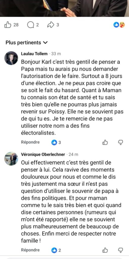 Puis c’est un hommage à Alain Tollemer, un militant décédé en 2020, qui provoque l’indignité. Ce qui s’apparente à ses deux filles ont vivement réagit sur les réseaux sociaux, répondant à Karl Olive : « C’est gentil mais tu aurais pu nous demander, surtout à huit jours d’une élection, je ne peux pas croire que ce soit le hasard » lui répond une première, « pas question d’utiliser la mémoire de papa à des fins politiques » enchaîne la seconde.